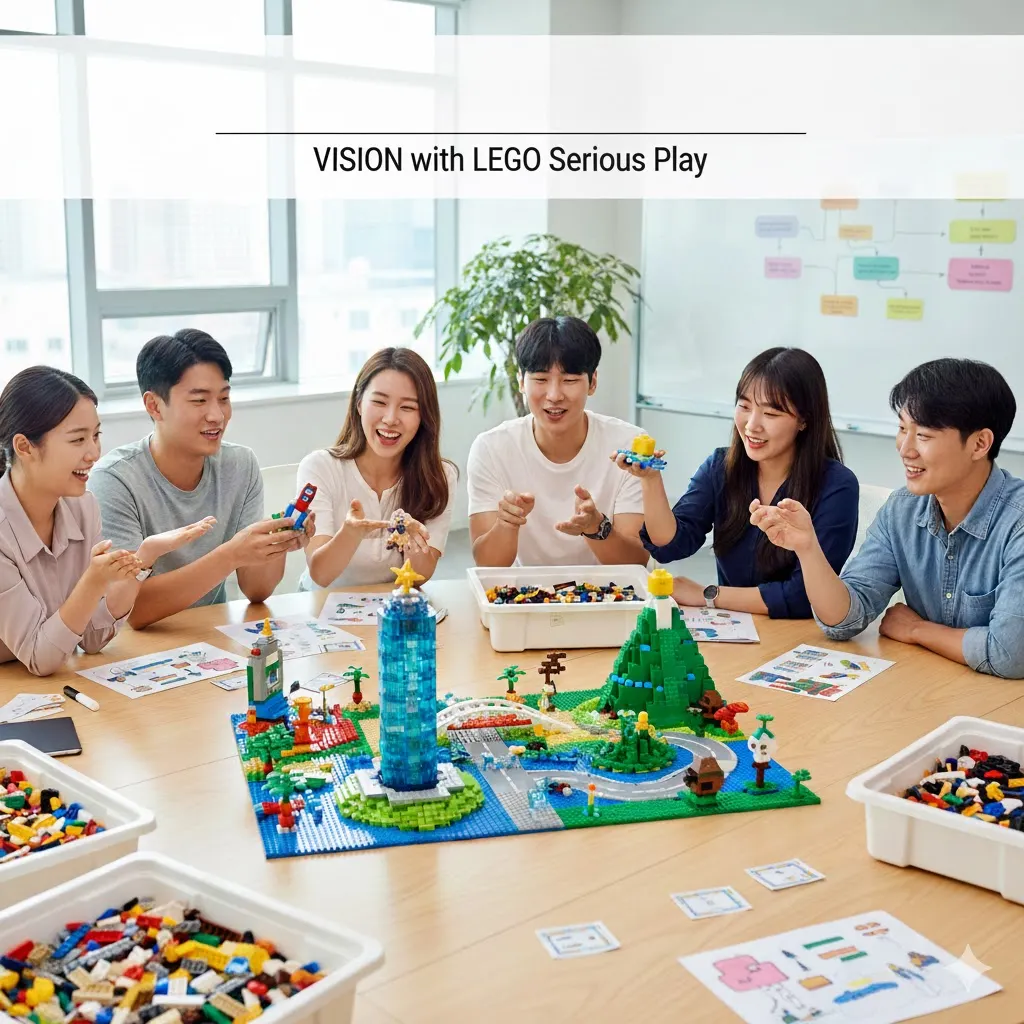 메타포(Metaphor) 활용: 추상적인 '비전'과 '가치'를 레고 브릭으로 형상화합니다. 손을 움직여 모델을 만드는 과정에서 뇌의 활동이 극대화되며, 평소 생각지 못한 창의적인 인사이트가 발현됩니다.