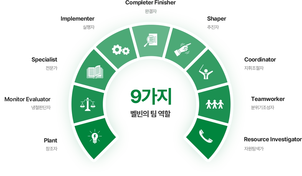 조직에서 각자가 책임지고 있는 기능적 역할(Functional Role, R&R)외에도 팀의 미션을 성공적으로 달성하기 위해서는 9가지 팀역할(Team Roles)을 수행하는 구성원이 필요합니다